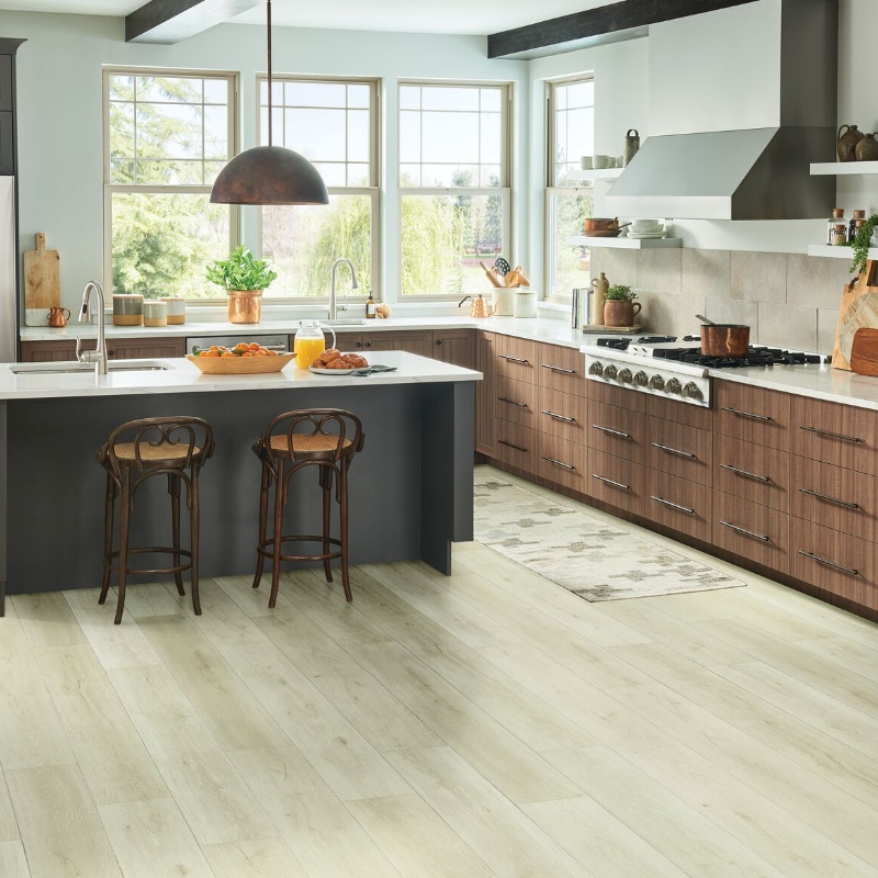 Everguard is the answer if you love solid hardwood flooring but don’t want to risk water damage. Its rigid core construction handles cold, dry, or humid conditions without losing integrity. And it’s 100% waterproof. So, you don’t have to drop what you’re doing to wipe up spills frantically. Your floors won’t suffer an ounce of damage. Plus, rigid core flooring delivers a natural wood look. You can choose from traditional or distressed wood finishes in oak, pine, or white oak with 20 color options.