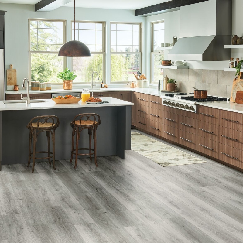 Everguard is the answer if you love solid hardwood flooring but don’t want to risk water damage. Its rigid core construction handles cold, dry, or humid conditions without losing integrity. And it’s 100% waterproof. So, you don’t have to drop what you’re doing to wipe up spills frantically. Your floors won’t suffer an ounce of damage. Plus, rigid core flooring delivers a natural wood look. You can choose from traditional or distressed wood finishes in oak, pine, or white oak with 20 color options.