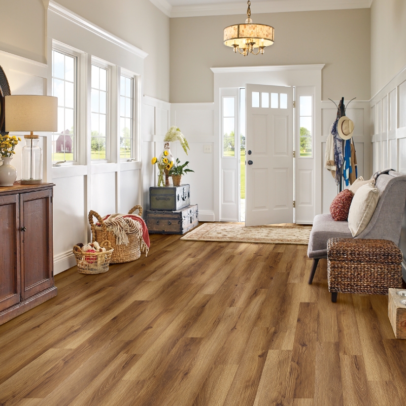 Everguard is the answer if you love solid hardwood flooring but don’t want to risk water damage. Its rigid core construction handles cold, dry, or humid conditions without losing integrity. And it’s 100% waterproof. So, you don’t have to drop what you’re doing to wipe up spills frantically. Your floors won’t suffer an ounce of damage. Plus, rigid core flooring delivers a natural wood look. You can choose from traditional or distressed wood finishes in oak, pine, or white oak with 20 color options.