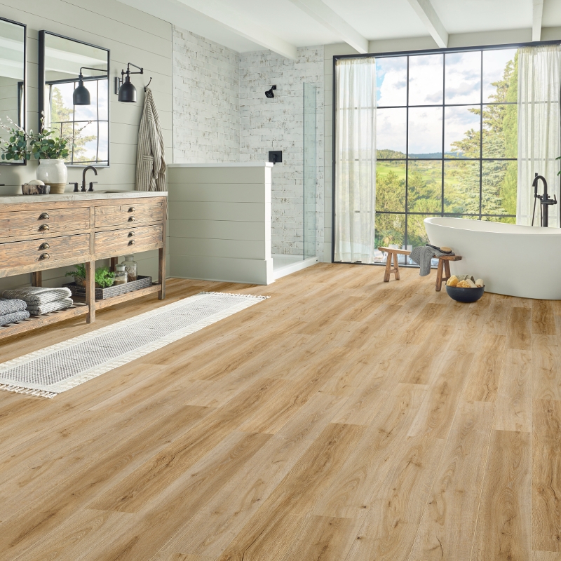 Everguard is the answer if you love solid hardwood flooring but don’t want to risk water damage. Its rigid core construction handles cold, dry, or humid conditions without losing integrity. And it’s 100% waterproof. So, you don’t have to drop what you’re doing to wipe up spills frantically. Your floors won’t suffer an ounce of damage. Plus, rigid core flooring delivers a natural wood look. You can choose from traditional or distressed wood finishes in oak, pine, or white oak with 20 color options.
