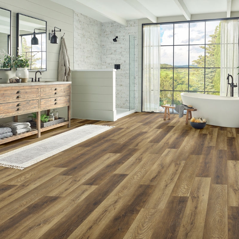 Everguard is the answer if you love solid hardwood flooring but don’t want to risk water damage. Its rigid core construction handles cold, dry, or humid conditions without losing integrity. And it’s 100% waterproof. So, you don’t have to drop what you’re doing to wipe up spills frantically. Your floors won’t suffer an ounce of damage. Plus, rigid core flooring delivers a natural wood look. You can choose from traditional or distressed wood finishes in oak, pine, or white oak with 20 color options.