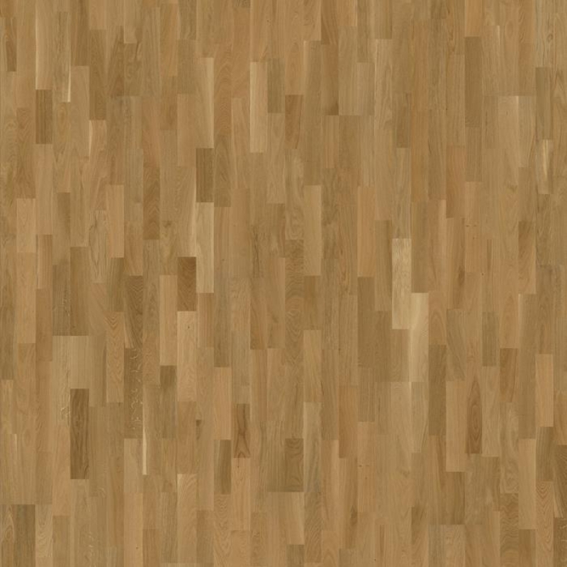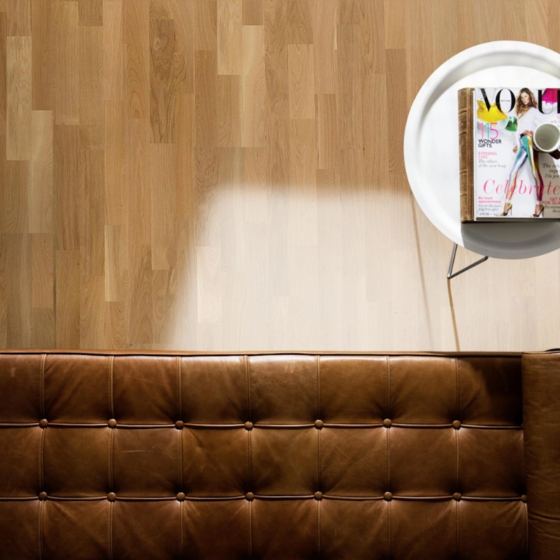 Warm brown and caraway tones in this 3-strip oak floor create a calm, even look. Specially selected planks with minimal knots offer a clean, balanced expression.