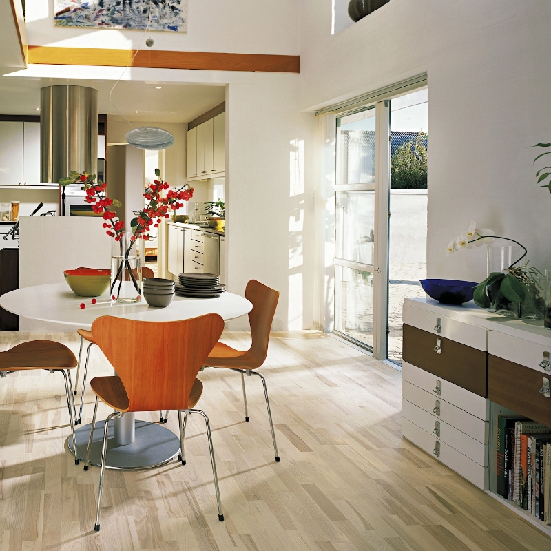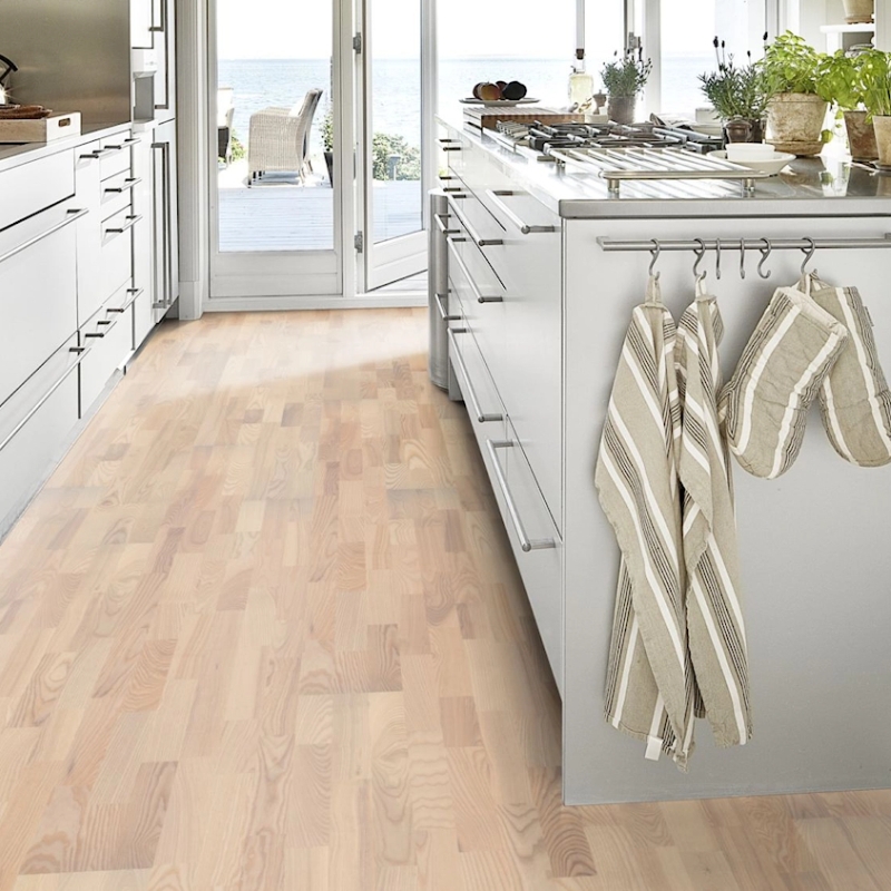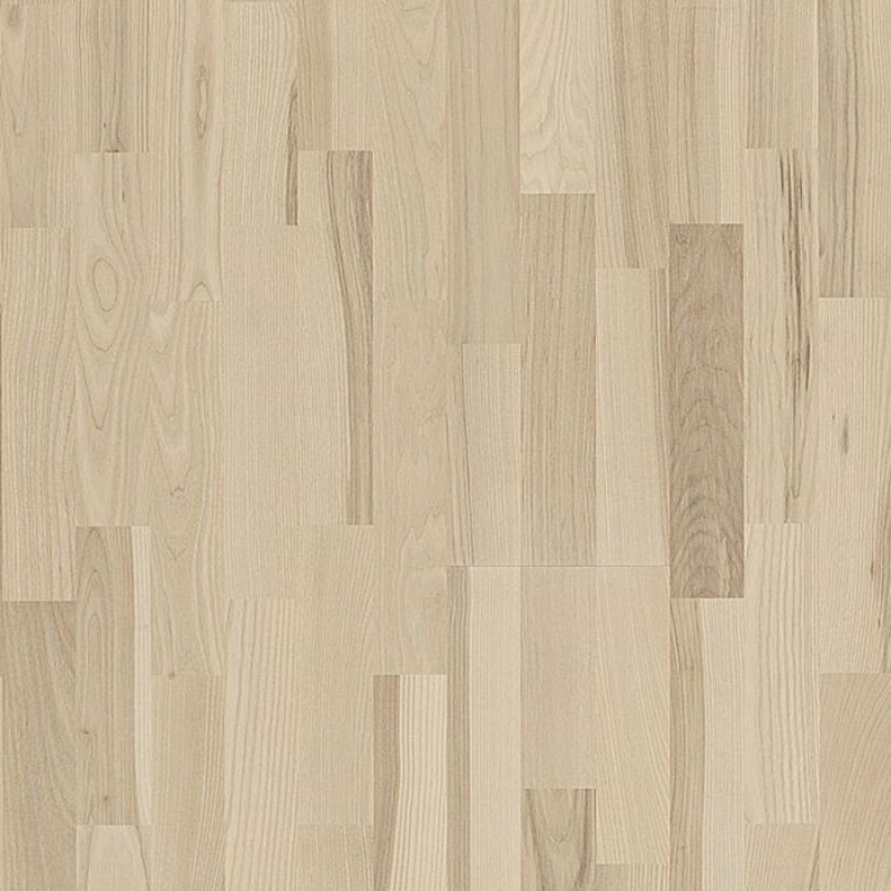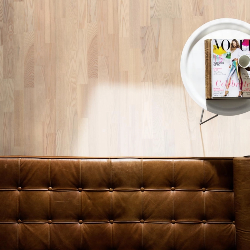 3-strip ash floor with a subtle white stain that lets golden-brown grain patterns shine through for a timeless, versatile look. Finished with matt lacquer for soft sheen and everyday protection.